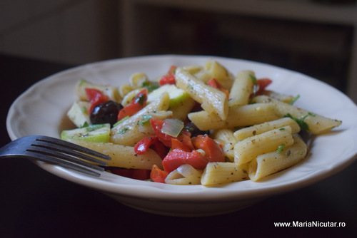 Fierbeti pastele doar putin, inainte de a ajunge la pragul al dente 🙂 Deci nu sunt suficient de facute. Strecurati apa si pastrati-o intr-o cana mare. Adaugati legume tocate marunt si lasati la foc mic. Adaugati verdeturi aromatice (busuioc, oregano, cimbru etc.) si apoi adaugati cate putina apa iar focul sa fie in continuare mic. Legumele se vor sota, la fel si verdeturile si pastele 🙂 Copiii iubesc pastele cu legume cat timp nu vad prea mult verde in farfurie si cat timp le dau un strop de ketchup pe marginea farfuriei 🙂