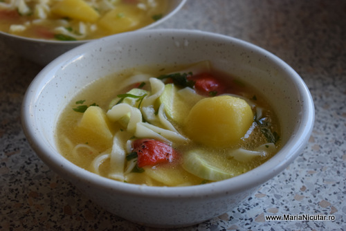 Fierbem legume impreuna cu 3-4 cartofi tocati cuburi. Spre final, adaugam taitei si lasam totul sa fiarba pana cand acestia sunt perfect facuti. Apoi garnisim cu patrunjel si stingem focul. Mancarea este gata si este una dintre cele mai simple si delicioase retete vegetariene din lume. Supa tine loc si de pranz, chiar si de cina. Pentru mine, cel putin, supa chiar este un inlocuitor de masa si are foarte putine calorii.