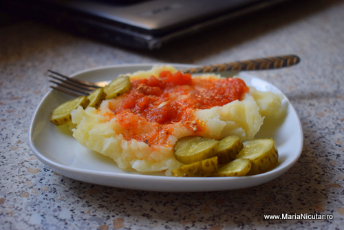 Piure-ul se poate aroma cu putin ulei de masline sau orice ulei va place. Si puteti adauga in el si lapte vegetal daca vreti sa obtineti un preparat vegetarian delicios. Langa piure servim sos de rosii facut clasic italieneste, ca un sos marinara pentru paste. Si combinatia merge de minune cu 2-3 castraveti murati. Sosul de rosii se face din rosii tocate si scazute in tigaie cu putin ulei de masline, sare, piper, oregano uscat, 2-3 catei de usturoi zdrobiti marunt. Amestecam sosul de rosii pana cand devine perfect de servit iar rosiile se fac praf. Vrem un sos de rosii delicios si care sa dea putina stralucire unui piure, oricat de banal ar fi.