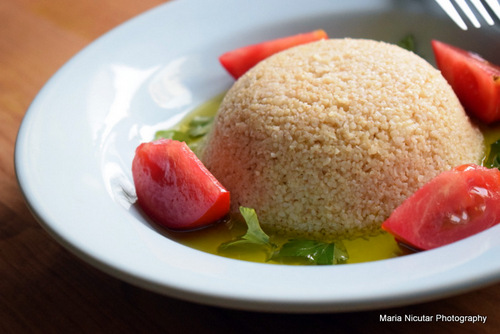 Cous – cous – ul se pune intr-un bol incapator si il amestecam cu putina sare. Peste el turnam apa fierbinte clocotita atat cat sa acopere cous cous-ul cu 2 degete, ca la bere, in reclama cu Florin Piersic. Punem o farfurie peste bol si lasam aburul sa se formeze si cous cous-ul sa se umfle. Rasturnam bolul cu cous cous cam in 20 de minute sau cat e necesar ca el sa absoarba toata apa si sa fie umflat perfect si bobul sa fie moale, usor de mestecat. In farfuria in care am rasturnat bolul cu cous cous vom mai pune o salata de rosii cu sare, piper, patrunjel, ulei de masline si un catel de usturoi tocat marunt. Salata aceasta aromata va merge de minune langa cous cous.