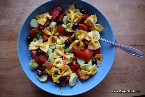 Este de fapt o salata de paste pe care am incercat-o in Italia si in Grecia. Pastele se fierb al dente si apoi se combina cu rosii tocate cuburi, castraveti, ceapa, masline, patrunjel verde. Stropim cu ulei de masline, suc de lamaie, adaugam sare si piper si servim una dintre cele mai bune retete vegetariene din lume.