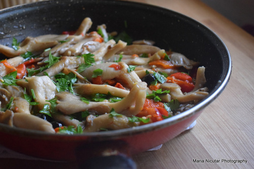 Spalam ciupercile si le taiem codita. Le punem la innabusit intr-o tigaie incapatoare cu putin ulei, sare, piper, condimente la alegere. In aproximativ 15 minute, ciupercile incep sa sfaraie usor, sunt deja facute partial si atunci putem pune si un ardei gras tocat marunt, un dovlecel si lasam totul la innabusit macar 15 minute sau cat e necesar ca ciupercile sa fie bine pregatite. Asezonam cu patrunjel verde si avem o tigaie delicioasa de ciuperci si alte legume. Este una dintre cele mai delicioase retete vegetariene, cu putine calorii si usor de pregatit.