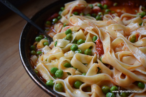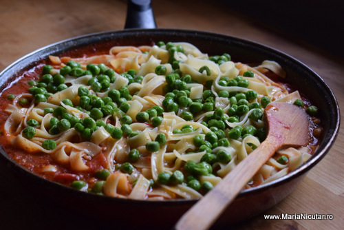 Tocam o ceapa mare si o lasam la innabusit pana cand se inmoaie perfect. Apoi adaugam mazare si o lasam la fiert cu putin ulei, sare, piper, cimbru, 3-4 catei de usturoi, dafin, oregano si orice alte condimente va plac. Eu mai pun boia de ardei uneori fiindca mi se pare ca se potriveste cu mazarea. Cand mazarea e fiarta, adaugam si sos de rosii si il lasam si pe el sa dea 3-4 clocote. Apoi dam drumul la paste fierte al dente si bine scurse. Mai lasam totul pe foc inca 2 minute si servim. Mazarea se potriveste cu sosul de rosii iar pastele se potrivesc si ele cu sosul de rosii. Nu ar fi pacat sa nu le facem cunostinta intr-unul dintre cele mai delicioase retete vegetariene din lume?