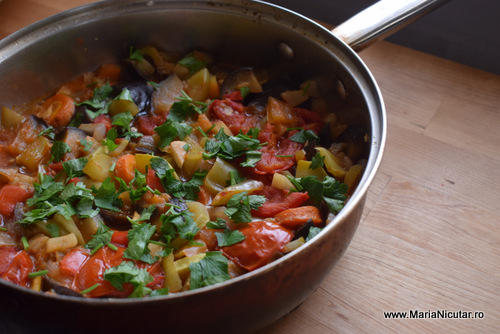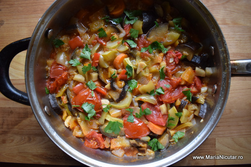 Tocam ceapa, rosii, ardei gras, dovlecei, vinete, ciuperci. Le dam drumul intr-o tigaie incapatoare, cu putin ulei de masline, 4-5 catei de usturoi, sare, piper, dafin, cimbru, ce condimente doriti, o cana de apa. Punem capacul pe oala, lasam focul mediu, mai amestecam din cand in cand. In maxim 45 de minute avem tocanita gata si sigur va fi un deliciu pentru toata familia. Si este si o mancare sanatoasa cu putine calorii.