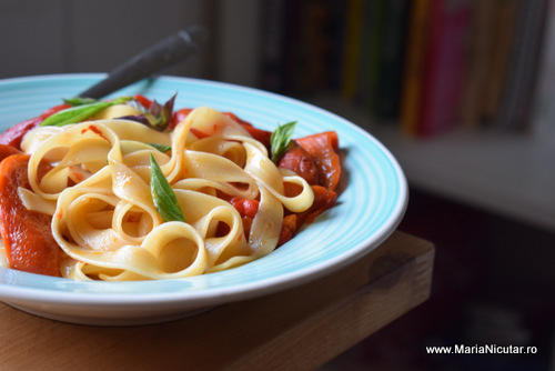 Ardeiul copt de la congelator sau direct din borcan, daca nu aveti proaspat copt, se toaca in felii subtiri si se trage la tigaie cu putin ulei de masline, sare, piper, 2-3 catei de usturoi sa dea gust si aroma. In maxim 2 minute putem sa dam drumul la pastele fierte si scurse de apa. Mai tragem totul la tigaie timp de 5-6 minute maxim si e masa gata. Garnisim cu busuioc proaspat daca avem sau cu busuioc uscat. Nu e nicio suparare daca in loc de busuioc veti folosi patrunjel verde.