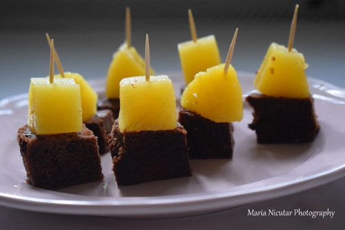 Negresa este un pandispan cu cacao. Taiem cubulete si deasupra punem cuburi de ananas.