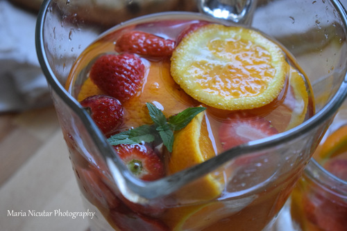 Apa alcalinizanta: apa plata, suc de lamaie, felii de portocale, capsuni proaspete, menta si orice alte verdeturi aromatice doriti.