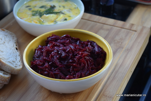 Salata de sfecla rosie fiarta, hrean, ulei de masline, suc de lamaie.