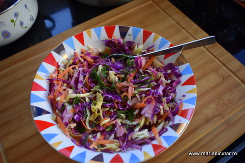 Salata de varza alba, varza rosie, morcov, marar, ulei de masline, suc de lamaie.