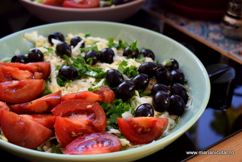 Salata de rosii, castraveti, ardei gras, masline negre, masline verzi, tofu, ulei de masline, suc de lamaie.
