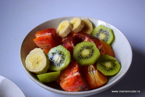 Salata de portocale rosii, banane, kiwi, clementine, suc de limeta.