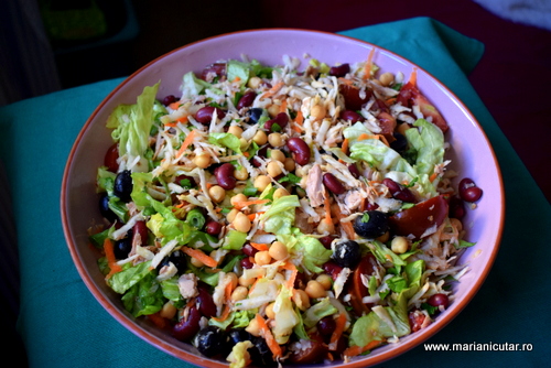 Salata de naut fiert, fasole rosie fiarta, patrunjel verde, ceapa verde, ulei de masline, suc de lamaie.