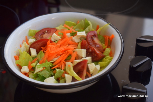 Salata de telina data pe razatoare, rosii, patrunjel, ulei de masline, suc de lamaie proaspat stors.