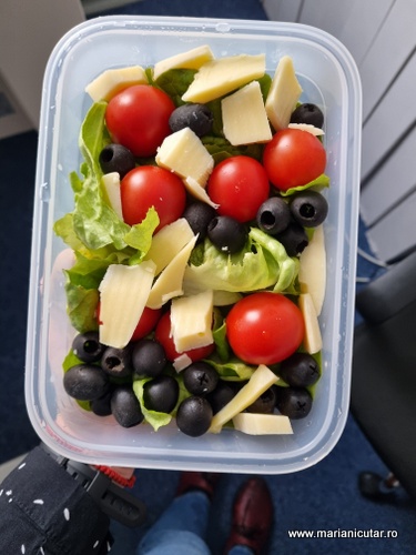 Culorile bucatariei mediteraneene 🙂 Intr-o caserola de 5-6 lei imi iau pranzul la mine aproape zilnic. 4-5 rosii mici, o mana de masline, 4-5 frunze de salata verde, cateva cuburi mici de branza si cam atat. Este un pranz frugal pe care il poti servi cu gandul la Creta, Spania, Italia, Grecia, Turcia, orice doresti.
