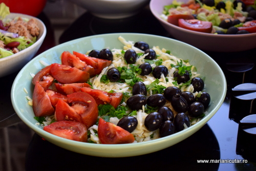 Salata verde, masline kalamata, castraveti, rosii, ardei kapia, branza tare italieneasca 🙂 Nu mai adaug ulei de masline si nici sare pentru ca maslinele si branza sunt si sarate, si uleioase. Dieta mediteraneana este absolut sanatoasa si delicioasa, poate veni la pachet cu putine calorii si cu indice glicemic redus, dupa cum vedeti 🙂