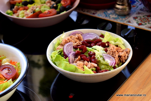 Salata mediteraneana de ton, salata verde, ceapa verde, fasole rosie, ulei de masline, suc de lamaie, sare, piper. Cu toate ca pare banala, va asigur ca va tine de foame pentru ca este un preparat culinar bogat in proteine si fibre. Atat fasolea rosie, cat si tonul au fibre si proteine de calitate superioara.