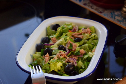 Salata verde cu ton, ceapa rosie, masline, ulei de masline, suc de lamaie, sare, piper 🙂 Este o salata simpla si aparent banala dar va asigur ca toate ingredientele sunt specific mediteraneene iar rezultatul este absolut delicios, sanatos, hranitor.
