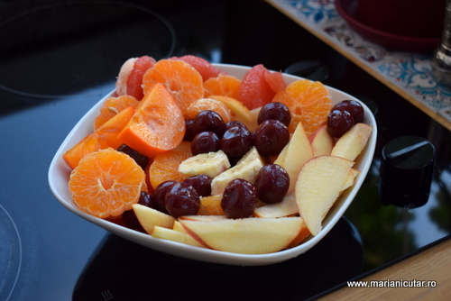 Salata mediteraneana de fructe: clementine, grapefruit, mere, pere, banane, visine din compot 🙂 Este alegerea fiului meu, el a combinat toate fructele si ne-am inspirat dintr-o carte de retete culinare grecesti 🙂 David are gusturi bune.