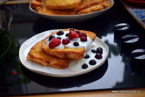 Friganele cu iaurt grecesc si fructe de padure 🙂 Friganelele sunt facute din paine integrala si prajite in ulei de masline, ca sa pot face tot preparatul mai mediteranean 🙂
