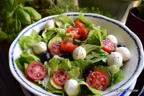 Salata verde tocata marunt, castraveti, masline, rosii, mozzarella sau tofu, oregano uscat mult de tot, ulei de masline, suc de lamaie, sare de mare si piper proaspat macinat. Oare sa va spun cati antioxidanti avem in aceste ingrediente enumerate de mine in total? Pe putin 20 dar cel mai sigur vreo 30. Si sunt valorosi, pretiosi, minunati si ar trebui sa profitam de ei din plin. Ii avem in hrana noastra cu un scop bun.
