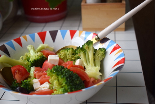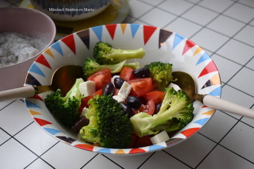 Broccoli se rupe in buchetele si se pune intr-o oala cu apa clocotita, la foc mediu. Fierbim maxim 3-5 minute si scurgem bine. Cine doreste poate sa stinga focul si sa lase broccoli sa stea in apa clocotita fara sa mai fiarba nimic. Eu fac asa de multe ori, caz in care obtin un broccoli mai dur, mai ferm. E si mai bun, din punctul meu de vedere. Dupa ce l-am scos din apa clocotita si este bine scurs, adaugam rosii cuburi, masline, branza de capra sau tofu, ulei de masline, suc de lamaie, sare si piper. Este una dintre acele salate de slabit care nu va lipsi din meniul meu pentru nimic in lume.