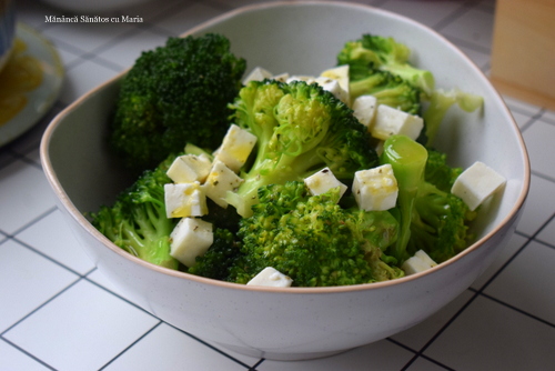 Broccoli se rupe in buchetele potrivite si se pun in apa clocotita cu un praf de care timp de 3-5 minute. Scurgem bine buchetelele de broccoli si le punem intr-un bol. Adaugam branza sau tofu, ulei de masline, sare, piper, suc de lamaie. Este o salata calda delicioasa si care nu lipseste din meniul meu saptamanal. Broccoli contine cativa dintre cei mai valorosi antioxidanti din lume.