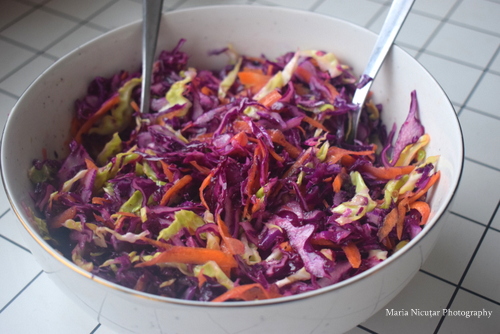 Tocam marunt varza alba, varza rosie, morcov. Amestecam toate legumele intr-un bol incapator si stropim cu ulei de masline, otet, sare si piper. Este una dintre cele mai bune salate de slabit pentru mine.