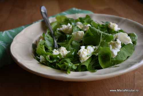 Salata de rucola, branza de capra sau feta, porumb, ridichi, ulei de masline, piper, suc de lamaie.