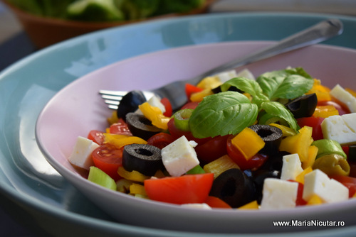 Nu trebuie sa mai adaugati sare daca salata vi se pare suficient de sarata datorita branzei si maslinelor. Este un preparat care trebuie sa tina de foame macar 3-4 ore. Eu sunt total de acord ca alaturi de aceasta salata sa fie consumate si 1-2 felii de paine integrala.
