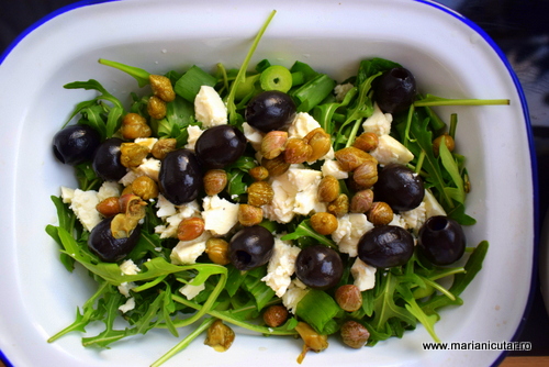 Salata greceasca de rucola, branza de capra sau feta, masline, capere, ulei de masline, otet balsamic.