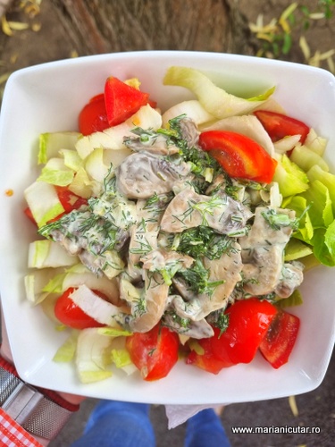 Salata mediteraneana de andive, rosii, ciuperci cu sos de iaurt si marar. Este o delicatesa bogata in fibre si proteine + multi antioxidanti. Toate ingredientele contin antioxidanti multi. Va asigur ca o sa va placa si o sa vreti sa o repetati pentru ca este o salata delicioasa, hranitoare, bogata in minerale si vitamine. Si daca nu va plac ciupercile Champignon, puteti folosi si Pleurotus. Dar sa fie preparate termic.