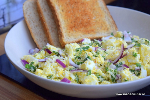 Salata de oua fierte cu ceapa rosie, patrunjel verde, frunze de telina, suc de lamaie, sare si piper. Se serveste pe paine 🙂 Este destul de grea daca nu e servita cu o sursa de fibre sau cu rosii alaturi 🙂