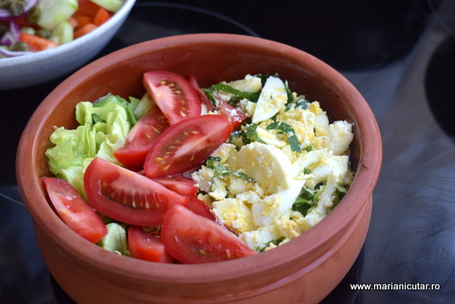 Salata cu oua fierte, branza feta, patrunjel verde, rosii, salata verde, ulei de masline, sare, piper 🙂 Este o salata delicioasa, foarte satioasa, usor de pregatit. Doar fierbem ouale, le tocam marunt, le amestecam cu branza maruntita, patrunjel verde tocat marunt, rosii tocate, salata tocata, stropim cu ulei de masline, adaugam un praf de sare daca mai este nevoie, putin piper.