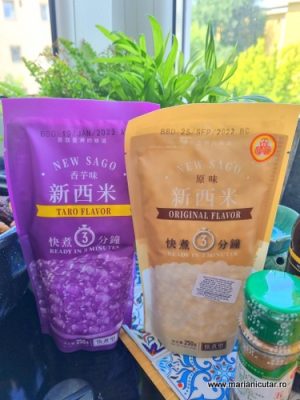 Mai jos este punga de perle de tapioca cu aroma de taro, o radacina asiatica delicioasa 🙂 Exista si perle de tapioca pentru Bubble tea fara aroma 🙂
