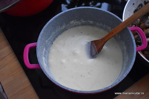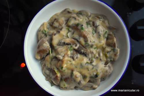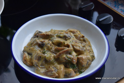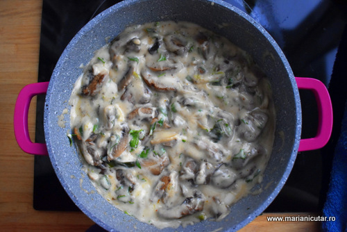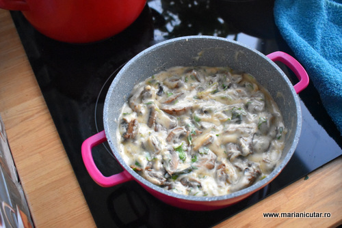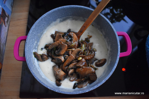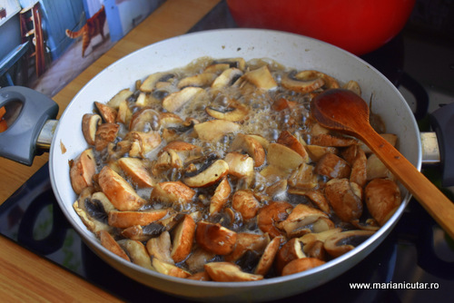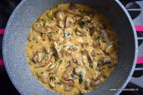 - Peste sosul ingrosat punem ciupercile rumenite si amestecam bine.