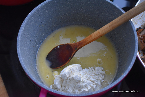 - Peste untul topit punem faina si amestecam bine. Omogenizam cu lapte turnat in fir subtire, amestecand cu telul sau cu o lingura de lemn. Focul sa fie dat la mic. Lasam sosul sa se formeze si il pastram pe foc maxim 3-4 minute.