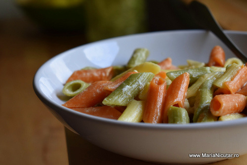 Alaturi de salata de castraveti va recomand o portie de paste in 3 culori. Pastele se fierb si se scurg de apa. Apoi se trag rapid intr-o tigaie incinsa impreuna cu 1 cubulet de unt si niste branza care va place voua. Poate sa fie telemea veche, maturata sau chiar parmezan. Stingem focul cand branza s-a topit pe paste.