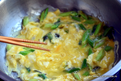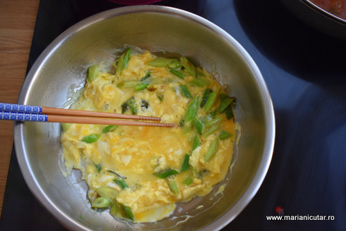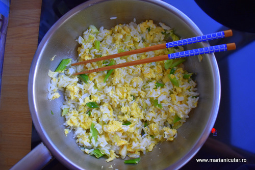 - Separat, batem ouale ca pentru omleta si adaugam putina sare si putin piper. Turnam ouale batute peste ceapa verde si le lasam sa se pregateasca la foc mic. Vom obtine o omleta pe care nu o lasam sa se faca 100%. Cand ouale sunt inca putin crude pe deasupra, adaugam orez fiert in tigaie si amestecam usor cu betisoare de bambus ca sa nu facem orezul praf. Oul se va lipi de orezul fiert fiindca noi am adaugam orezul fiert cand ouale inca nu erau perfect facute. Acesta este motivul pentru care nu facem ouale pana la capat, fiindca vrem sa se lipeasca de orezul fiert.