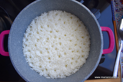 Aici este orezul fiert, in care se vede ca nu am amestecat. Apa s-a scurs, s-a absorbit in orez si a lasat orezul pufos, bob cu bob, in stil asiatic. Dupa cum vedeti, folosesc o oala antiaderenta simpla, cea mai ieftina pe care am gasit-o la hipermarket. Este o oala pe care o folosesc doar la orez si are un capac de sticla pe care il pun deasupra cand vreau sa fierb orezul. Focul mic, nu invartiti in orez, oricat sunteti tentati s-o faceti :)))