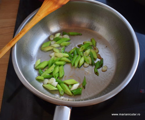 - Tocam ceapa verde si o sotam la foc iute cu putin ulei de floarea soarelui sau de susan pana cand se rumeneste un pic de tot. Maxim 2 minute tineti ceapa pe foc.