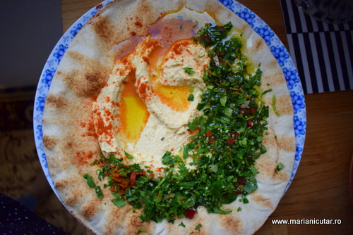 Humus cu paine libaneza si cu salata de patrunjel. Niciun post nu poate trece fara aceasta combinatie delicioasa, super sanatoasa. Este cea mai buna mancare de post la care as putea sa visez. Peste humus pun si ulei de masline si boia de ardei iute.