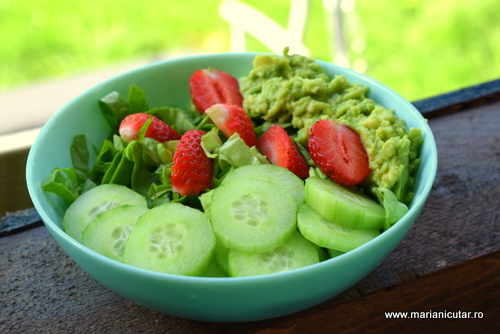 Pasta de avocado cu suc de lamaie, spanac verde proaspat, castraveti, capsuni 🙂 Este o salata putin mai originala decat clasicele salate pe care le pregatim de obicei. Este o explozie de antioxidanti care va va placea sigur.