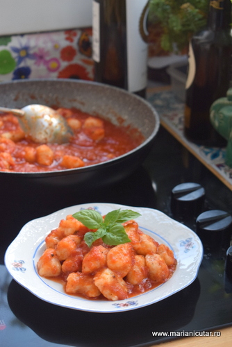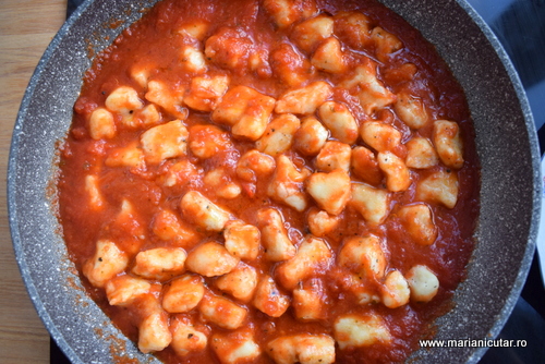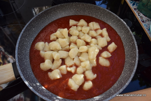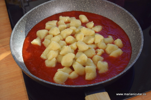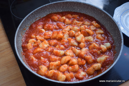 8. Gnocchii fierti se strecoara bine de apa si se pun direct in tigaia cu sos de rosii.
