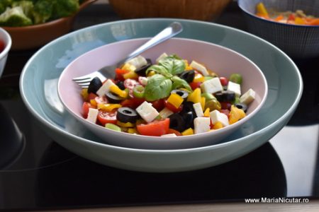 Am folosit masline, rosii, ardei gras, ceapa, castraveti, telemea, ulei de masline, sare, piper, putin suc de lamaie.