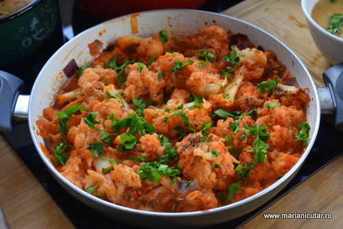 Secretul este sa fierbi conopida separat si sa faci sosul separat. Apoi, in sosul de rosii, care este un sos de rosii simplu, clasic, intalienesc, aici adaugam conopida fiarta si bine scursa de apa. Lasam conopida sa mai fiarba cu sosul de rosii cateva clocote si apoi adaugam patrunjel tocat marunt si servim 🙂 Sosul de rosii se prepara din sos de rosii + ulei de masline, sare, piper, cimbru, oregano, busuioc, 2-3 catei de usturoi, o cana de apa. Lasam sosul sa fiarba macar 5-6 minute.