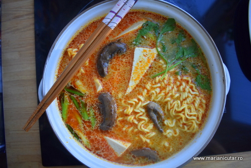 Fierbem ciuperci, morcovi si telina si cand sunt fierte, le dam deoparte. Adaugam in supa o lingurita mica de pasta de curry picanta sau nepicanta si o lasam sa dea un clocot. Stingem focul si adaugam in supa obtinuta taitei ramen (direct din pungile de supa asiatica), coriandru proaspat sau patrunjel proaspat, tofu tocat, ceapa verde. Servim cand sunt taiteii umflati ca lumea 🙂 Va garantez ca veti manca regeste o mancare asiatica sanatoasa, satioasa, delicioasa si care cred ca va va aduce zambetul pe buze, mai ales daca este picanta :))