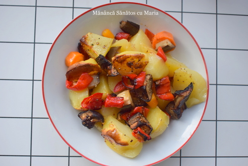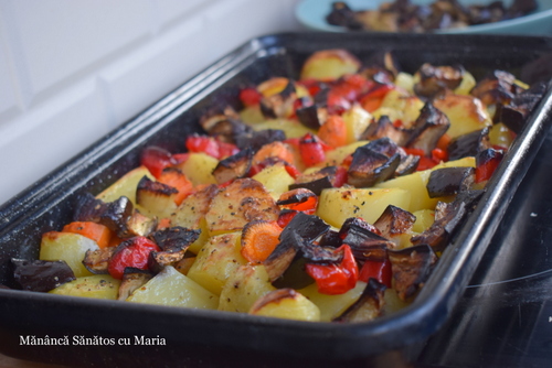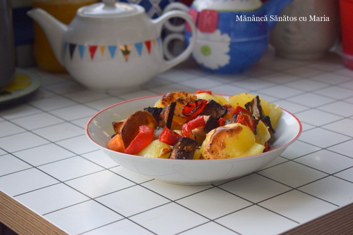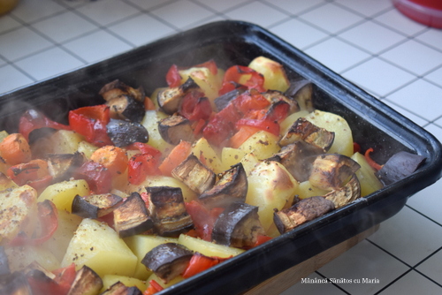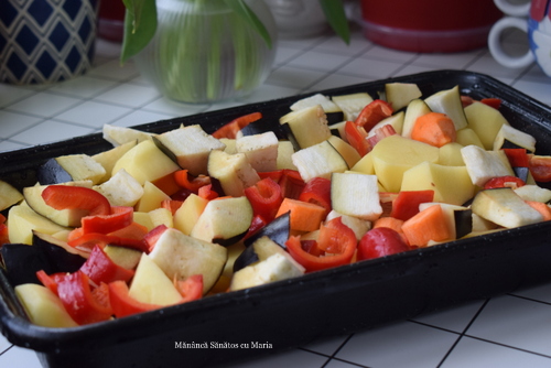 Deci este o bunatate de care nimeni si absolut nimeni nu se plange vreodata. Evident ca intre legume poti pune si ce fel de carne doreste musafirul. Eu iubesc legumele asa cum sunt asa ca nu voi pune nimic in tava lor. Le voi servi cu mujdei, muult mujdei. Usturoiul nu lipseste din casa noastra, niciodata. Cred ca as iesi sa iau usturoi si la 2 noaptea daca s-ar intampla sa descoper ca nu mai avem.