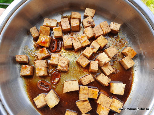 - Tofu se toaca cuburi si se lasa la marinat in sos de soia cu sos de chili si ulei de susan.