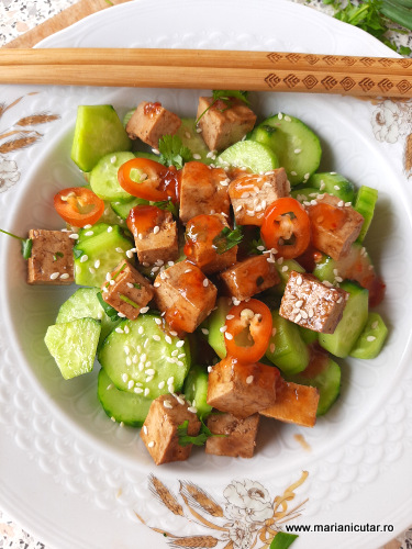 - Amestecam tofu marinat cu tot cu sosul format + castravetii cu ardei iute si coriandru.