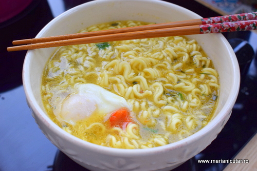 - Adaugam la final sare, piper, ardei iute, ghimbir, sos de soia, pasta Miso, suc de lamaie, patrunjel, 2 oua nebatute, taitei ramen din pachet.